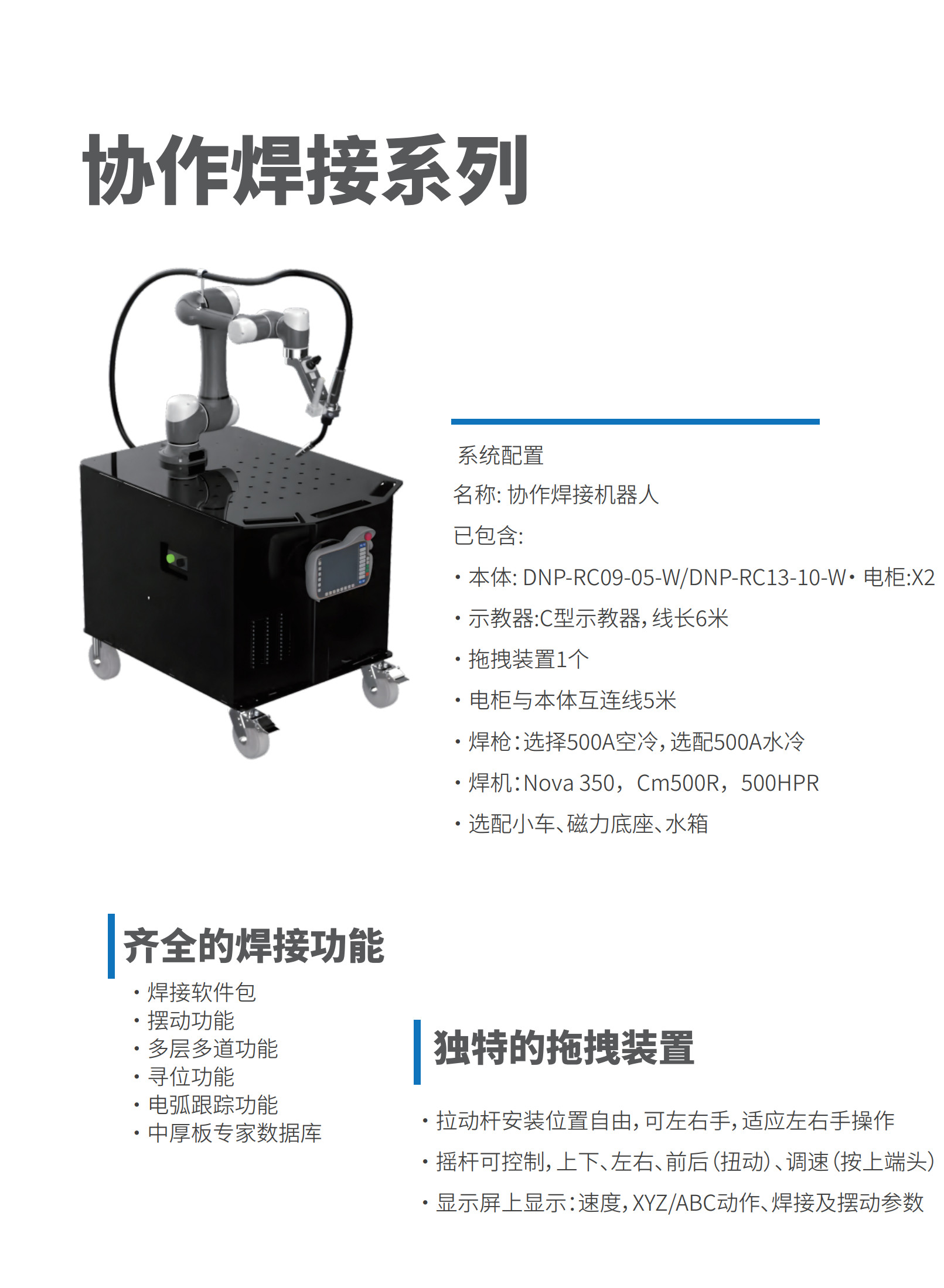 德诺普协作焊接机器人首创摇杆多向摆动,精细定位;手柄屏实时调参,无需示教器;拖拽力度可设;拖动摇摆脱离示教器;支持多样焊接工艺;存上万点位,程序即存即用 。